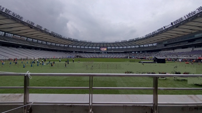 席の間隔も十分です。ドリンクホルダーあります。荷物を置いてもこの感覚。東京を冠したゆとりあるスタジアム